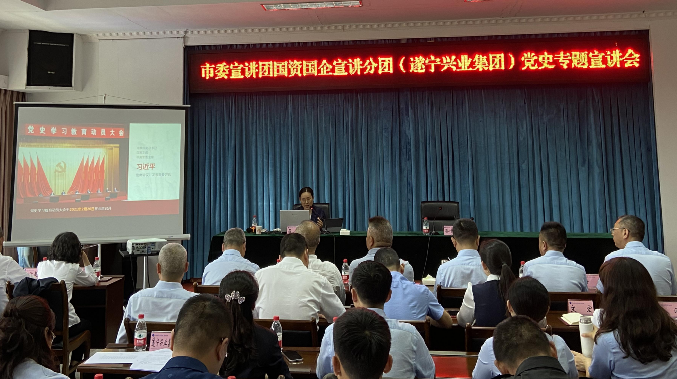 ? ? 5月11日,市委宣講團(tuán)第十分團(tuán)成員、市委黨校教研室主任屈燕走進(jìn)遂寧興業(yè)集團(tuán),開(kāi)展黨史學(xué)習(xí)教育專題宣講。集團(tuán)公司及各直屬企業(yè)領(lǐng)導(dǎo)班子成員、中層干部,以及黨員和基層員工代表聆聽(tīng)了宣講。集團(tuán)公司黨委委員、紀(jì)委書(shū)記蔡坤辰主持宣講會(huì)并對(duì)下一階段黨史學(xué)習(xí)教育提出要求。